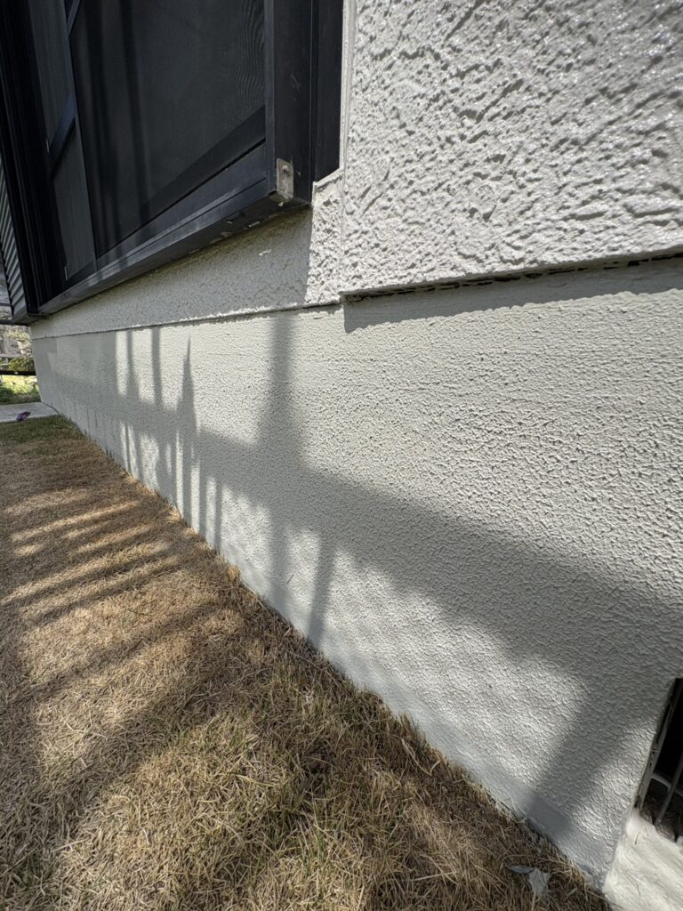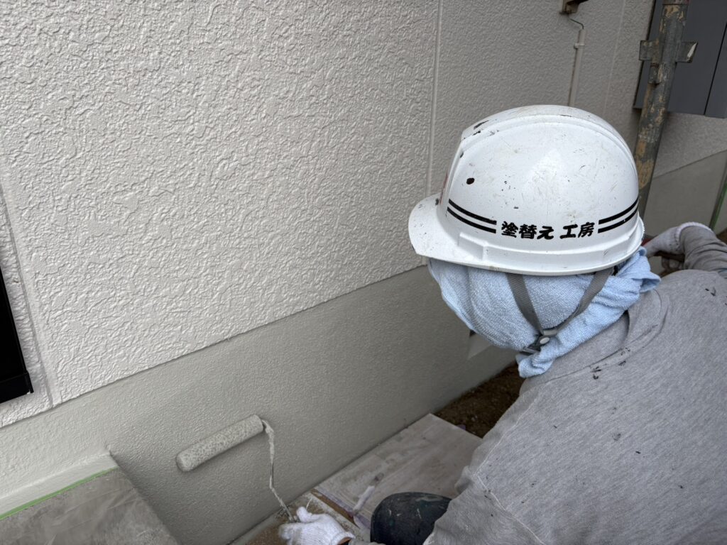 今回のお客様の基礎は劣化が多く見受けられたため、普通に塗るのではなく厚付け塗装にしました。初めに基礎の下地処理を行い基礎のひび割れ・基礎の破損個所の補修から始めました。