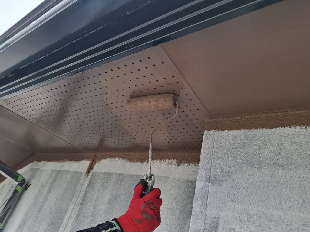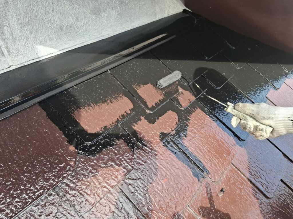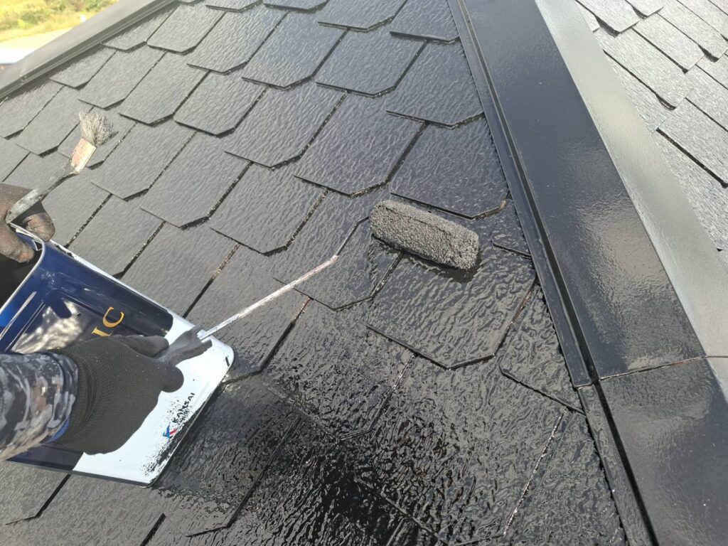 ・今回外壁中塗りに使用した材料は関西ペイント:ダイナミックルーフ ネオブラック カタログ色をローラーで外壁全体に塗布いたしました。下塗り同様、細かい箇所・狭い箇所につきましては刷毛を使用し塗料塗布いたしました(下写真)