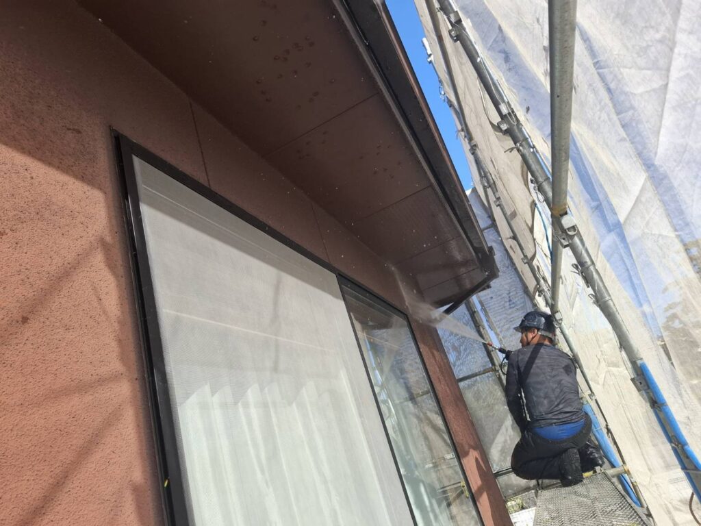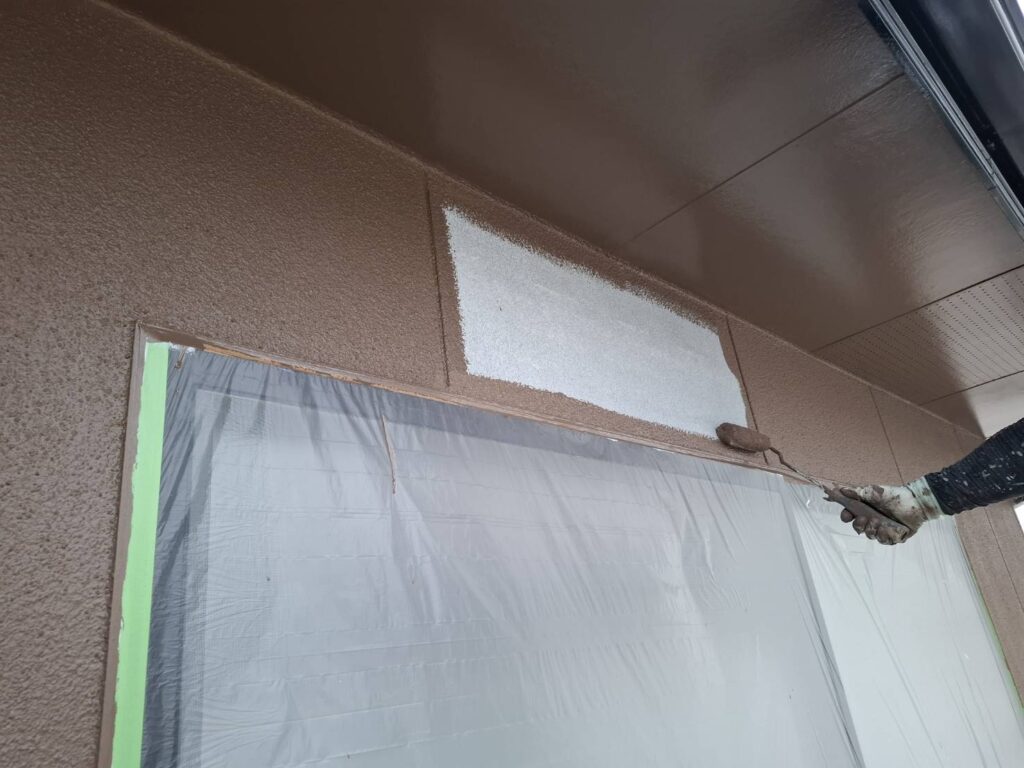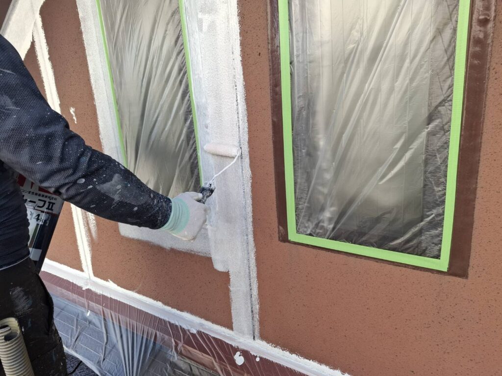 高圧洗浄後外壁全体に下塗りとして関西ペイント:ダイナミックフィーラーを塗布いたしました。
