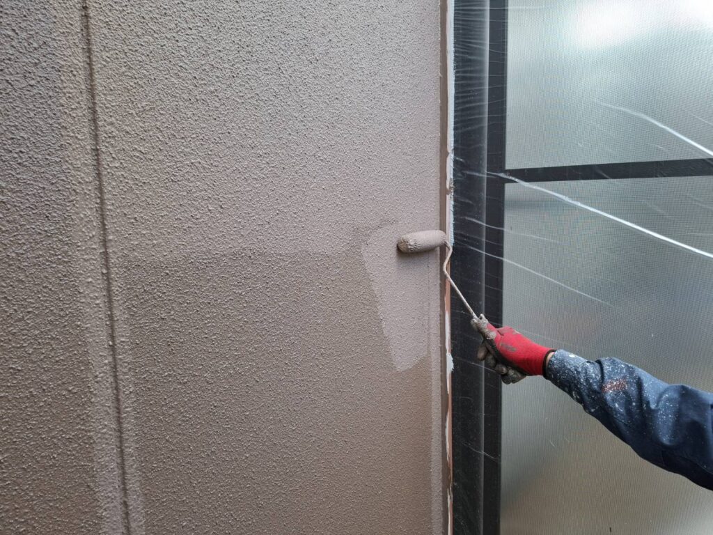 ・今回外壁中塗りに使用した材料は関西ペイント:ダイナミックトップ 15-40D カタログ色をローラーで外壁全体に塗布いたしました。下塗り同様、細かい箇所・狭い箇所につきましては刷毛を使用し塗料塗布いたしました(下写真)