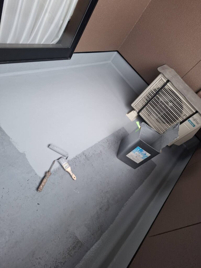 研磨紙で下地調整→アセトン(有機溶剤)で汚れと油分除去→防水層塗布(グレー色)→トップコート塗布。今回既存防水がFRPの為アトミクス:アトレーヌ防水層とアトレーヌ水性トップSG(遮熱グレー色)を使用しました。