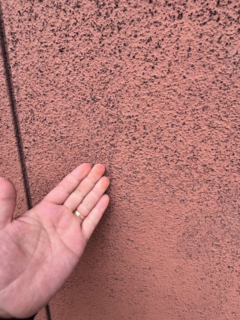 ・屋根北面に汚れが付着しており、外壁全体にチョーキング(白亜化現象)が見受けられました。(下写真2枚)