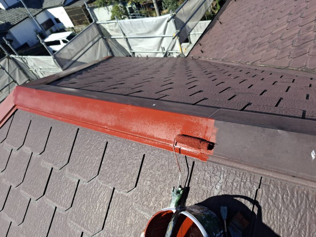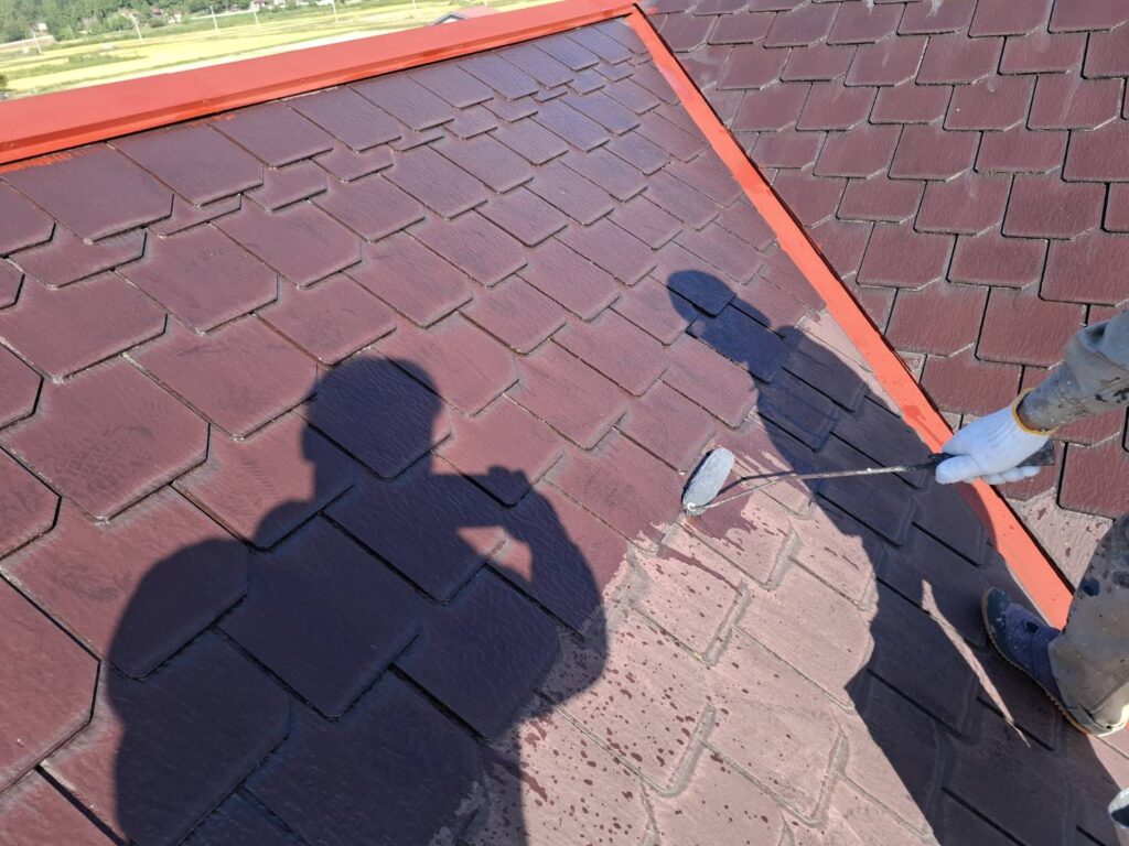・高圧洗浄後、屋根コロニアル部分に関西ペイント:ダイナミックシーラーマイルドを塗布いたしました。板金部分には関西ペイント:1液エスコマイルド赤さび色を塗布いたしました。(下写真2枚)